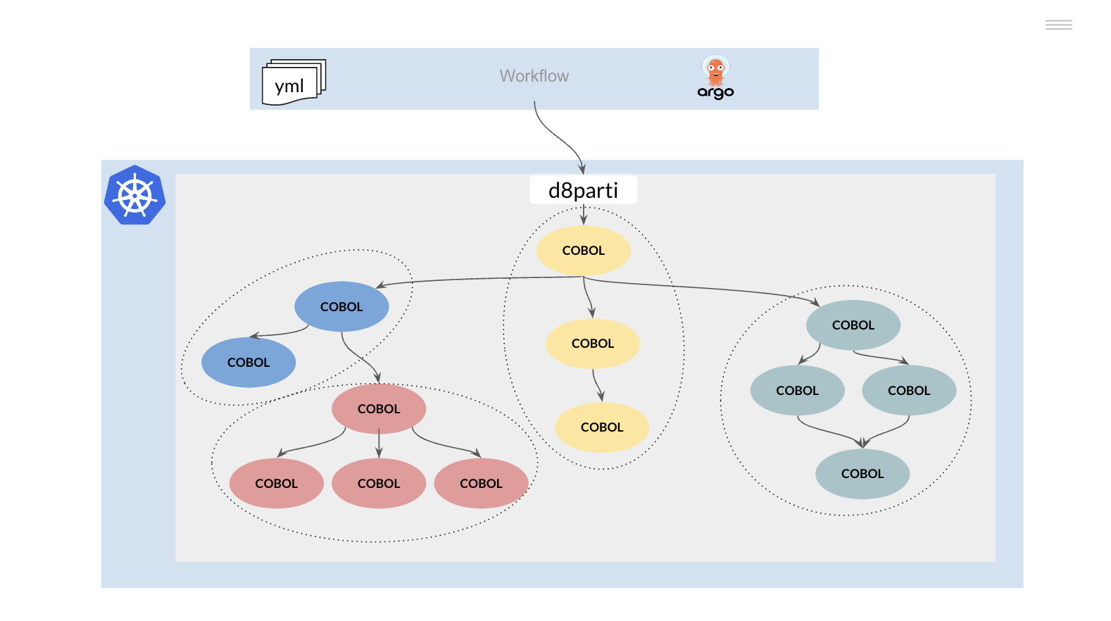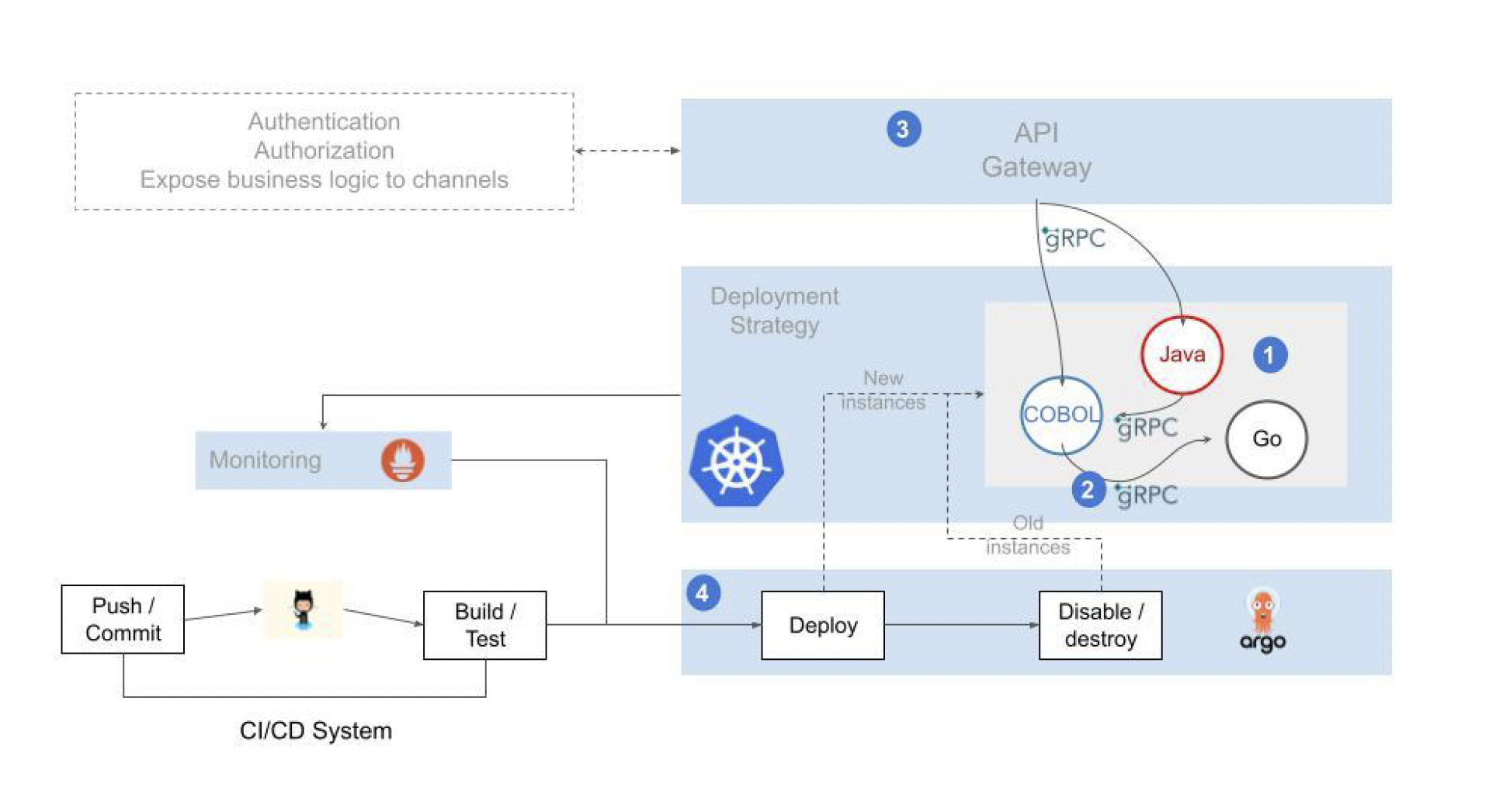 COBOL programs can be recompiled and exposed as microservices. These microservices can communicate with any other microservice, regardless of the programming language used (COBOL, java, python, go,…) and inherit all the functionalities of the technical platform (authorisation, encryption, monitoring, automation of deployments, etc).